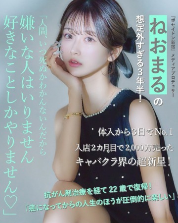話題のキャバ嬢オーディション番組『LAST CALL』に審査員として出演中! キャバクラ界の超新星、歌舞伎町『ポセイドン新宿』のねおまるさんボーテ初登場! ワンセット3,400円の格安店で毎月4桁超えしていた池袋時代にはじまり、卵巣癌での休業、抗がん剤治療を経てのキャバクラ復帰、そして幸せを追求した現在の働き方まで…。ねおまるさんの自己紹介コラムをお届け♡「癌になってからの人生のほうが圧倒的に楽し...