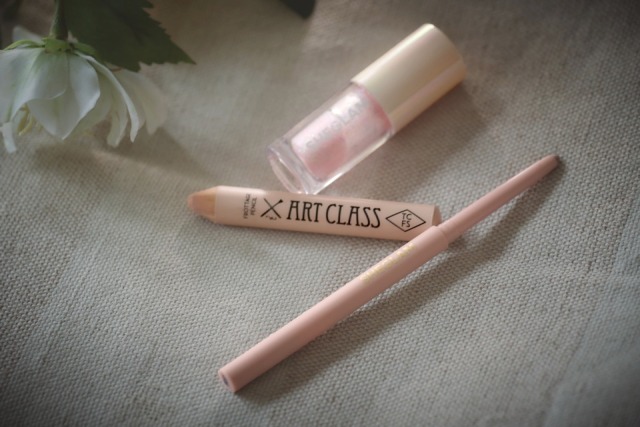 上まぶたに色をのせないっていうのも中顔面短縮の工夫。アイシャドーパレットの一番薄い色だけ塗って、あとちょっとキラキラを重ねる程度。上を軽くするとそのぶん下まぶたが強調されて中顔面が短く見える気がするので(笑)