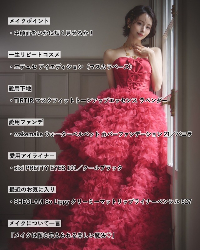 もうね、いかにして中顔面を短く見せるかがメイクのテーマなので。他にもチークは目の下に逆三角形にポンポンと入れるとか、涙袋や人中短縮のオーバーリップ…とか、いろいろと工夫してます。