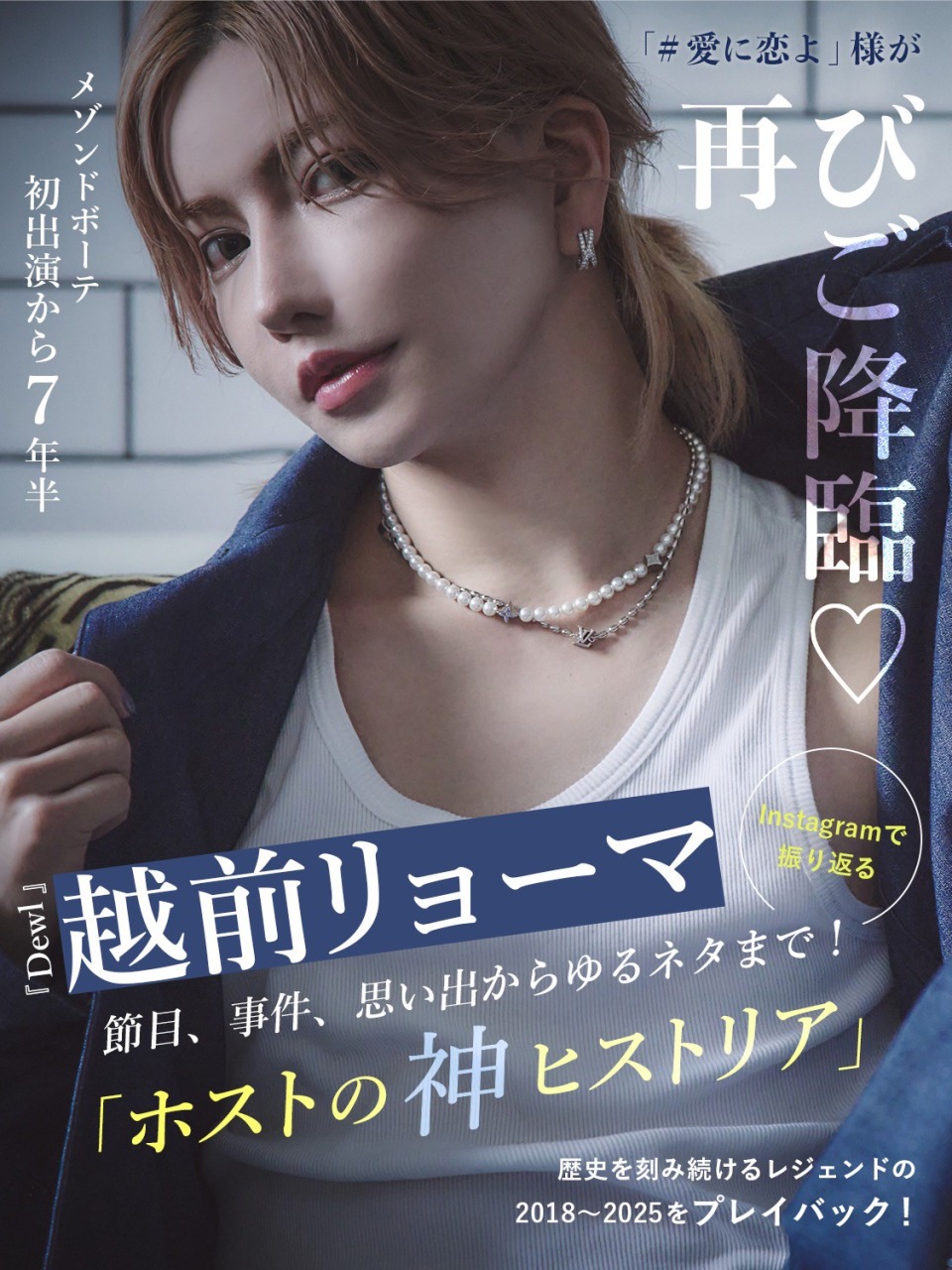 言わずと知れた“ホストの神”、越前リョーマさん(Dプレオーナー)が超久々のご降臨! 初出演からざっと7年半。その間には本を出版したり、殿堂入りしたり、オーナーになったり…と様々な歴史が! というわけでリョーマさんの2018~2025年をプレイバック。節目の出来事からゆるネタまで、インスタ投稿を見返しながらその年その年のトピックスを一緒に振り返ってみました♡
