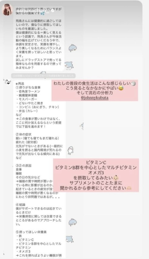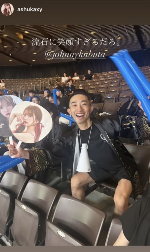 飛鳥さんといえばマネージャー的な役割を果たしている専属の付き人(ジョニーさん)がいることでも有名。業務全般をサポートするジョニーさんですが、元パーソナルトレーナーというキャリアを活かし飛鳥さんの健康面もサポート。食事内容を分析し不足している栄養素を補うべくサプリを用意するなど、その働きぶりがしごでき過ぎると話題に! 写真は関コレ出演中の飛鳥さんを応援するジョニーさん。ちなみにジョニーさんもお酒は飲めないそう♡