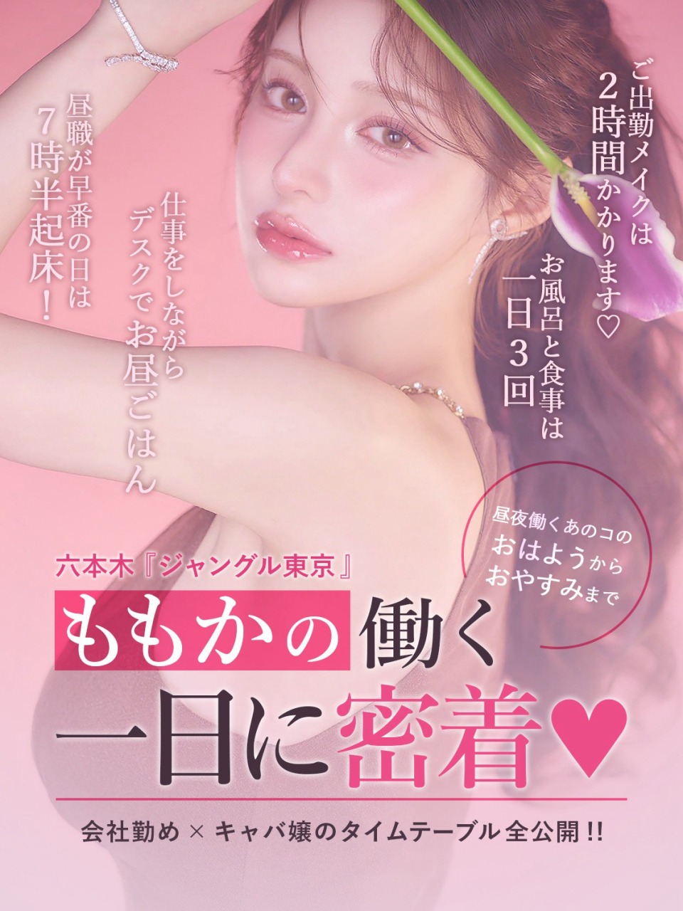 売れっ子キャバ嬢さんは普段どんな生活を送っているのか? おはようからおやすみまで有名嬢の日常を追跡する「働く一日」シリーズ。今回密着したのは新卒で就職した会社に今も勤め続けている、六本木『ジャングル東京』のももかさん♡
