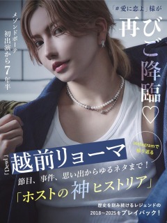 言わずと知れた“ホストの神”、越前リョーマさん(Dプレオーナー)が超久々のご降臨! 初出演からざっと7年半。その間には本を出版したり、殿堂入りしたり、オーナーになったり…と様々な歴史が! というわけでリョーマさんの2018~2025年をプレイバック。節目の出来事からゆるネタまで、インスタ投稿を見返しながらその年その年のトピックスを一緒に振り返ってみました♡ 越前リョーマの2018:過去一ひどい顔で... 続きを読む